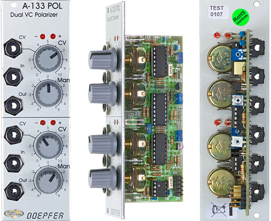 A-133 is a special dual voltage controlled amplifier that enables both positive and negative amplifications. Negative amplification means in this context that the signal is inverted. The main application of the module is the processing of control voltages, e.g. ADSR or LFO. .