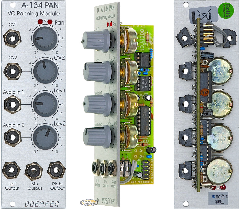 A-134 is a voltage controlled universal panning and/or crossfader module. If the module is used a voltage controlled Panning device one audio signal is panned to two different outputs. If the module is used a voltage controlled Crossfader two audio signals are mixed to one common output. The module enables even compositions of both functions..