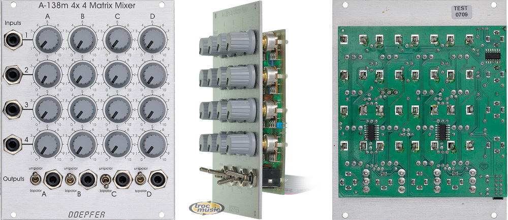 Module A-138m is a 4 x 4 matrix mixer with switches for unipolar/bipolar mode for each column. Unipolar means that the controls work as attenuators. Bipolar means that the controls work as polarizers..