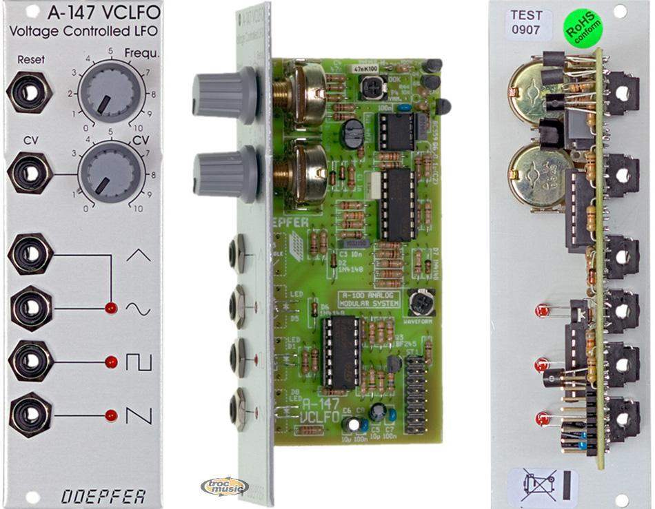 | Le module A-147 (VCLFO) est un oscillateur basse fréquence (lfo), qui produit des contrôles en tension de manière cyclique dans des fréquences comprises entre 50Hz et 1 minute (environ 0.015Hz) avec le bouton. Lorsqu'on branche dans son entrée contrôle un voltage, on peut aller jusqu'à 150Hz (fréquence audio). Le VCLFO peut être connecté comme une source de modulation (comme avec les LFO A-145 et A-146) sur toutes sortes de modules comme sur un oscillateur pour contrôler le PWM, ou pour contrôler la fréquence d'un filtre ou sur l'amplitude d'un VCA pour faire des trémolos. De plus vous pouvez synchroniser ce LFO via l'entrée reset avec un autre LFO ou un trig. 1 sortie triangle. 1 sortie sinusoïdale. 1 sortie carrée. 1 sortie dent de scie descendante. 1 entrée reset. |