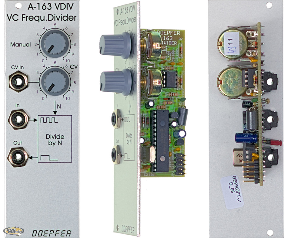 | Module A-163 is a voltage controlled audio frequency divider. The frequency of the input signal (preferably the rectangle output of a VCO) is divided by an integer factor N (N = 1, 2, 3, 4 ... up to 32). N can be adjusted manually and modulated with an external control voltage (e.g. from LFO, ADSR, Random, MIDI-to-CV, Theremin, Light-to-CV, analog sequencer) with attenuator. The control input has polarizing function, i.e. the manually adjusted dividing factor can be modulated upwards or downwards. The basic idea of a polarizer is described in the modules A-133 Voltage Controlled Polarizer and A-138c Polarizing Mixer.. |