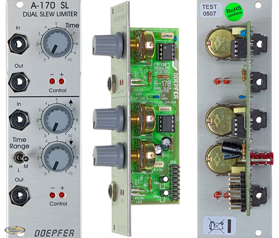 | Module A-170 contains two separate slew limiters, also known as portamento controllers or integrators. The first SL has just one joint control, which sets both rise and fall times (c. 0 ...10 sec). The second SL has separate controls for rise and fall times, and can therefore be used as a simple AR envelope generator. Over and above this, you can set the overall range for these parameters, with a three-position switch, as on the full ADSRs.. |