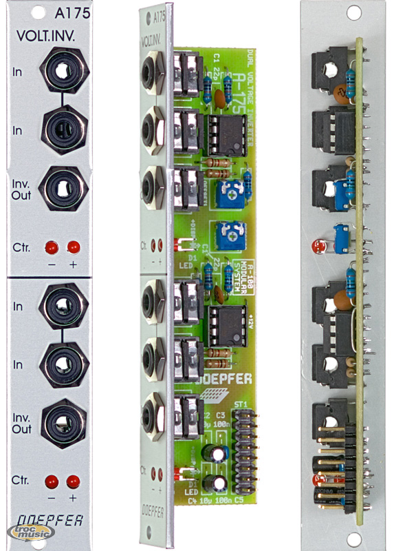Module A-175 (Dual Voltage Inverter) is exactly what it says it is: two identical inverters, which will take a voltage and output it in an inverted form - so that an input of +5 V will be output as -5 V, an input of -2 V will be output as +2 V, and so on..