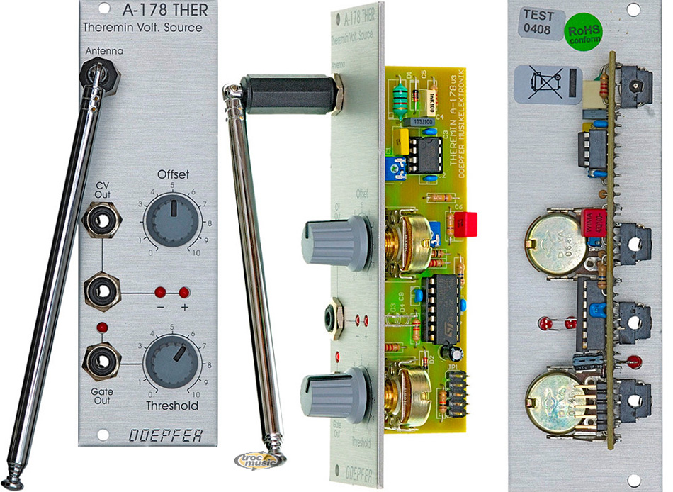 | Theremin module for generating a variable control voltage by approaching/removing hand to/from an antenna. The distance range is about 30 cm. Additionally the module is equipped with a Gate output with adjustable threshold level. Controls/Inputs/Outputs: antenna input, offset (knob for zero adjust), 2 x CV out, 2 x LED (for CV control positive/negative and zero offset adjust). |
