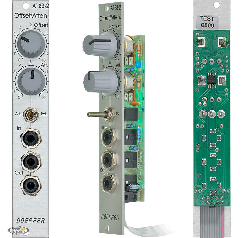 Module A-183-2 is a simple voltage offset generator combined with an attenuator/polarizer for the CV input. The function is similar to the vocoder slew-limiter module A-129-3. But the A-183-2 has only one channel available and does not offer the slew feature. Instead of that module A-183-2 offers another feature: switching between attenuator or polarizer function for the input control..