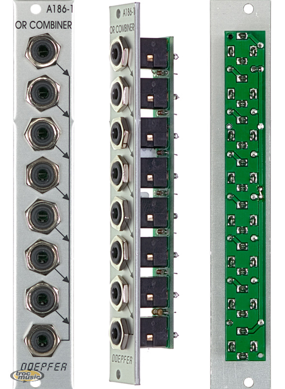 Module A-186 is a very simple, passive unit that combines up to 7 gate, trigger or analog signals by or-wiring. Function: if all seven inputs are low or open the output is low. if one or more of the seven inputs is ''high'' the output turns high.