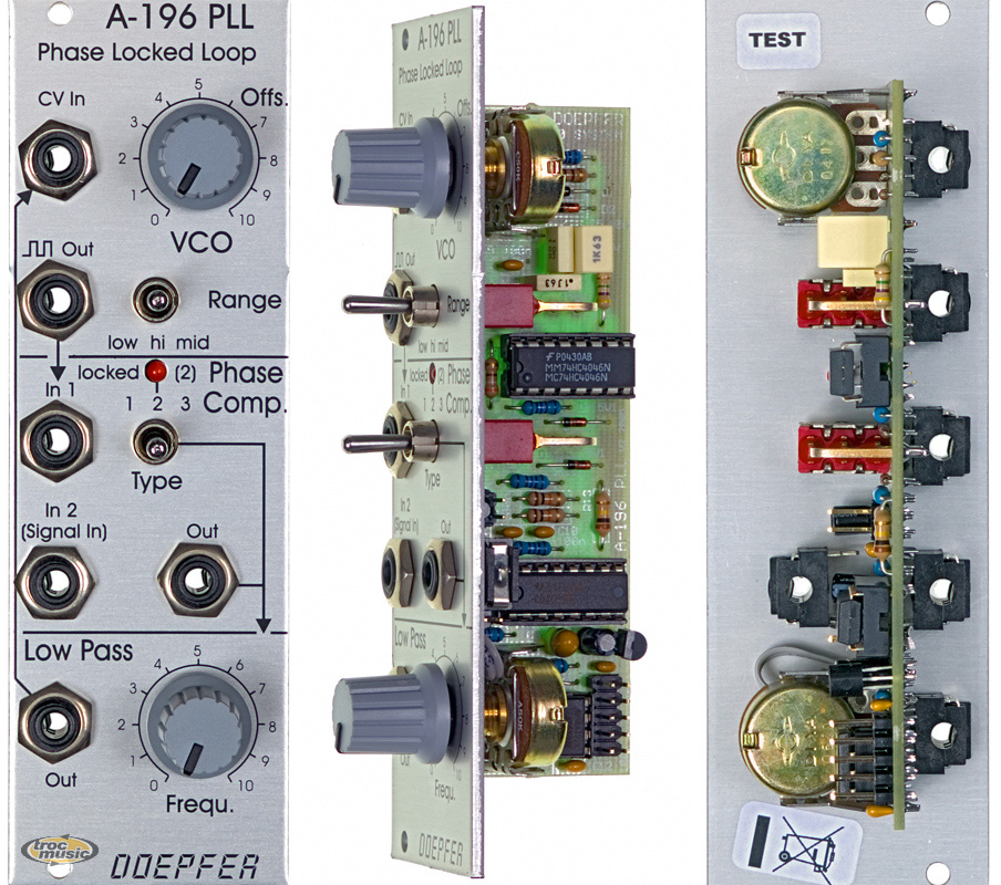 | Le module A-196 renferme ce que l'on appelle un Phase Locked Loop(PLL), fonction présente sur les ''Complex Waveform Generator'' model 259 des légendaires synthétiseurs Buchla. Un PLL est composé de trois parties : un oscillateur contrôlable en tension (VCO), un comparateur de phase (PC) et un filtre passe bas (LPF). Toutes ces parties sont connectées de façon a créer une boucle fermée ou Larsen de fréquence. . |