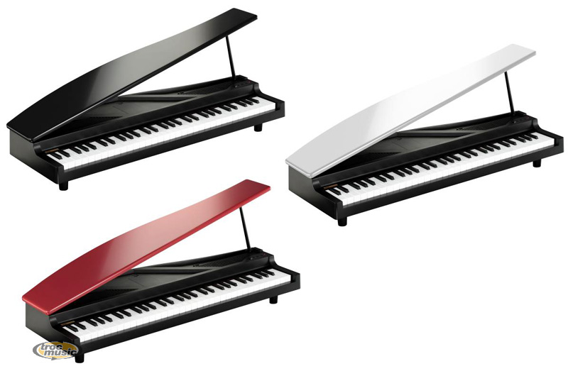 | Le MicroPiano de Korg est un piano à queue miniature de 61 touches à réponse naturelle, avec un couvercle qui s'ouvre ''comme un grand'', et qui intègre des sonorités de piano acoustique, pianos électriques, clavecin, karimba, toy piano, vibraphone, marimba, orgue, flûte, accordéon, harpe, violon et bien d'autres. Il est disponible en noir avec, au choix, un couvercle noir, rouge ou blanc. |