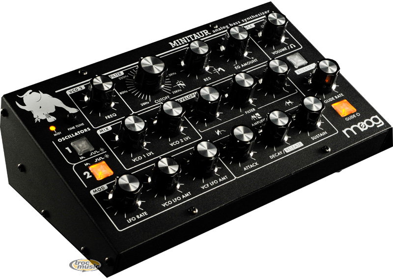 | Le Minitaur est le premier synthé de la série Taurus à ne pas comporter de pédales, mais il conserve la configuration classique de la marque consistant en un potentiomètre par fonction. Cette nouvelle conception permet son intégration dans de petites configurations et son entrée dans les environnements MIDI et USB, annonce Cyril Lance, l'ingénieur principal chez Moog Music. Châssis compact en acier. Interface consistant en un bouton par fonction. 2 oscillateurs stables avec formes d'onde en dent de scie et carré. Filtre Moog Ladder classique. 2 générateurs d'enveloppe ADSR de style Minimoog avec switch On/Off de release. 1 LFO avec forme d'onde en triangle synchronisable en MIDI pour moduler les VCF/VCO. Entrée MIDI IN sur DIN et MIDI par USB. Entrées CV pour le pitch, le filtre, le volume et la gate. Entrée audio externe. Sortie casque. |