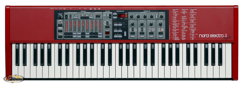Clavier scène 61 touches, polyphonie complète sur section orgue, 5 pianos électriques sur section piano.