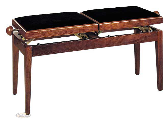 Banquette piano double noyer mat/velours brun. Sièges réglables séparement: 51 à 60 cm. Dim.siège x 2: (47 x 32)cm. Recouvrements: 2 x (44 x 29)cm. Poids: 10,8 Kg.