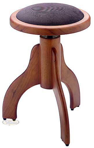 Tabouret piano/clavier merisier mat/velours brun. Hauteur réglable : 45 à 55 cm. Diamètre siège : 35 cm (galette 30 cm). Poids : 5 kg.