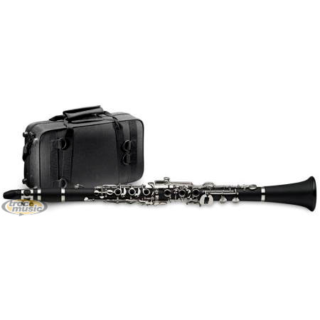 Clarinette sib, système allemand, 22 clés / 6 anneaux. Corps en bakélite imitation ébène, clétage nickelé. Livrée avec bec, ligature, couvre-bec, écouvillon et softcase.