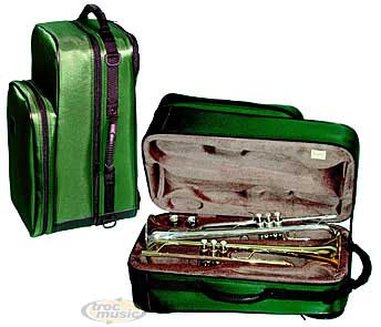 Véritable sac à dos avec un large compartiment accessoires. Pour 2 trompettes. Tissu Cordura 1000 deniers résistant à l'eau. Longueur 48,9 cm. Pavillon 12,7 cm.
