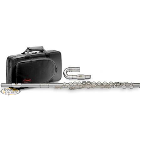 Flûte traversière en UT, 16 plateaux pleins. Sol décalé, mi mécanique. Deux têtes ( droite et courbe ). Livrée avec écouvillon.