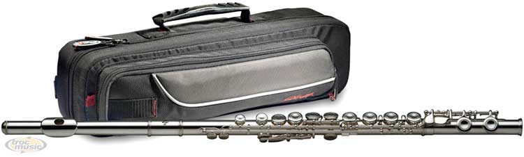 Flute traversière en Ut, 16 plateaux pleins. Sol décalé. Finition argentée. Livrée en softcase type sac-`-dos contenant des accessoires d'entretien.