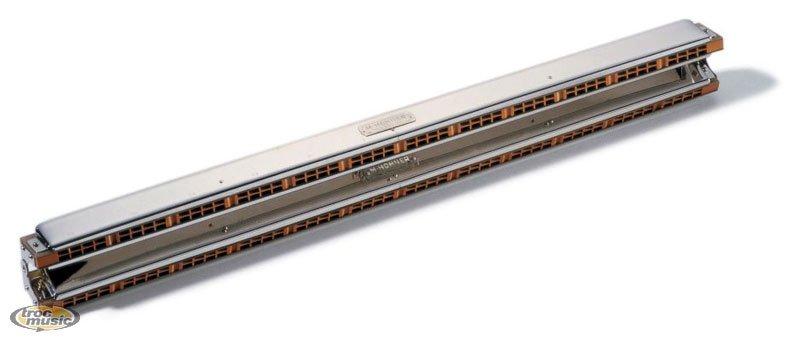 Harmonica d'Orchestre, série ''Accompagnement et Rythme''. Le plus grand harmonica du monde. Spécialiste des accords. 192 Trous. 384 Lames. Jeu de musique: cuivre; 1,05 mm. Corps bois (poirier). Dimensions 58,5 cm.