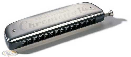 Harmonica chromatique 14 trous, 56 lames, sommier et corps plastique, tonalité en Do, accord tempéré, dimensions 19,1 cm.