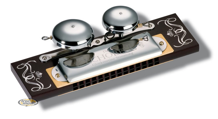 Une amusante pièce historique. Dans les années 20, Hohner proposa des harmonicas tremolo spéciaux dotés de clochettes. Ces 2 clochettes différentes permettent d'ajouter un élément rythmique inattendu à votre jeu. 28 Lames. Jeu de musique: Cuivre; 0,9 mm. Corps: Bois (érable). Longueur (cm): approx. 17.