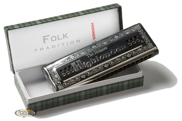 | Cet harmonica tremolo a été spécialement conçu pour jouer la musique celtique (cornemuse écossaise). Sur la face en La, on trouve un mode myxolydien, mais on a conservé la gamme majeure sur la face en Ré, ce qui permet de jouer facilement la musique écrite pour cornemuse. Le corps en bois est laqué de vert. Capots en acier inoxydable. Lames: 2 x 40. Jeu de musique: cuivre; 0,9 mm. Longueur approx. 14,7 cm. |