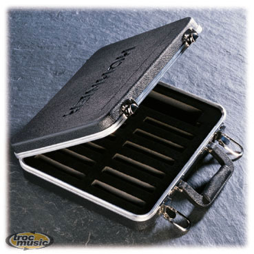 Transportez vos harmonicas en toute sécurité. Mallette constituée d'éléments en plastique résistant et d'une robuste armature aluminium. Elle peut contenir 12 diatoniques 10 trous et 1 chromatique (64 lames).