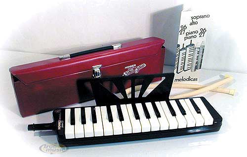 Mélodica ''Piano'' 27 touches. Tessiture Fa 3 - Sol 5. Livré avec étui, notice d'utilisation, bec, embouchure tuyau, pupitre.