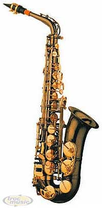 Saxo alto marque Genuine (anciennement Blanchard), métal noir, clé de fa dièse aigu, bec, anche, bocal, étui.