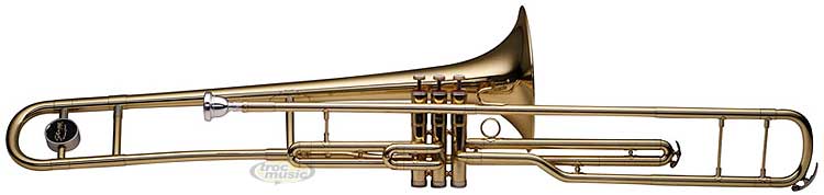 Trombone tenor en sib à 3 pistons, modèle long, avec étui en abs. Maillechort pistons, pavillon 203 mm, perce 12,3 mm. Finition verni.
