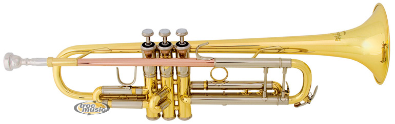 | Trompette Sib d'étude. Perce ML 460'' = 11,68 mm. Diam. du pavilon en laiton: Diam. 4 13/16'' (122,24 mm). Branche d'embouchure en cuivre rose, fourche sur coulisse 1er piston. Anneau de doigt sur La coulisse du 3ème piston. Pistons en acier fin. 2 clés d'eau. Embouchure originale V.Bach 7C, huile pistons V.Bach. Etui léger sac à dos avec bretelles sac à dos escamottables. Finition laquée ( disponible en finition argentée : TR-500S ). |