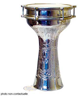 Darbuka turque en aluminium ciselé, cymbalettes interne, diam 18,5cm, H 34cm.