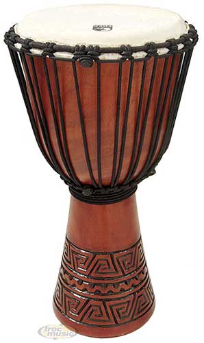 Djembe 8'' en acajou d'Indonésie sculpté. Peau de chèvre. Tension avec cordage traditionnel. Poignée de transport intégrée au cordage.
