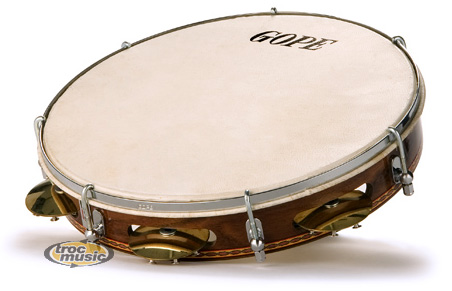 Pandeiro GOPE Bois 10'' Choro. Pandeiro en bois vernis fin avec 6 rangées de cymbales doubles en titane ce qui le rend extrémement léger. 6 tirants. Peau animale spéciale Choro 10''. Diamètre=10'' / Hauteur=5 cm / Poids=0.35 Kg.