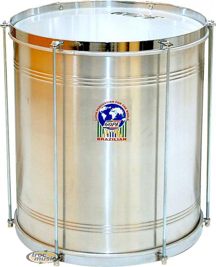 Surdo aluminium de fabrication brésilienne. 6 tirants (tiges zinguées), arceaux en aciers et boulons chromés. Diamètre=14'' / Hauteur=40 cm / Poids=2.9 Kg. Peaux plastiques 14''x190 microns.