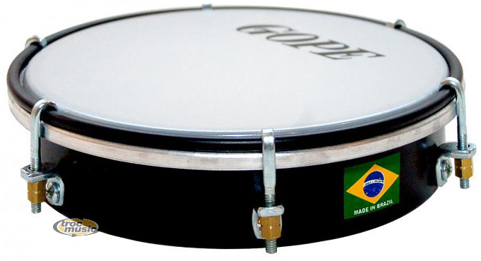 Tamborim de fabrication brésilienne. Tamborim en fer recouvert d 'une peinture époxy noire mate, arceau et boulons chromés , tirants zingués. Diamètre = 6'' / Hauteur = 4 cm / Poids = 0.35 Kg. tirants / Peau 6''x 250 microns. Petit tambourin de 6'' peu profond (environ 5 cm) en métal , bois ou fibre.