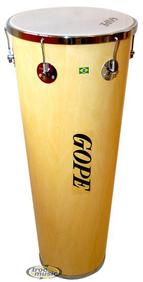 | Timbal Pro 14 x 90cm, de fabrication brésilienne. Timbal en bois vernis, arceau, tirants et boulons chromés. Diamètre=14'' / Hauteur=90 cm / Poids=3.250 Kg. Peau plastique cerclée aluminium 14'' x 250 microns. 6 tirants. Il est constitué d' un fût conique et monté avec une peau plastique bien tendue pour avoir de bons aigüs. On le retrouve dans les formations Samba Reaggae où il sert pour les solos. On le surnome le ''djémbé brésilien'' pour ses tonalités de basses profondes et ses aigüs francs. |