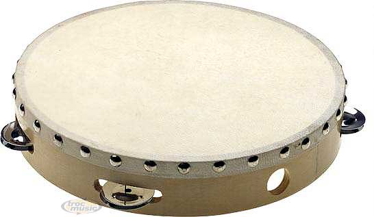 Tambourin 10'' en bois à peau fixe rivetée, 1 rangée de cymbalettes.