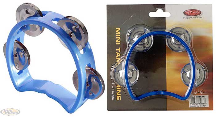 Mini tambourin avec 4 cymbalettes, en plastique bleu.