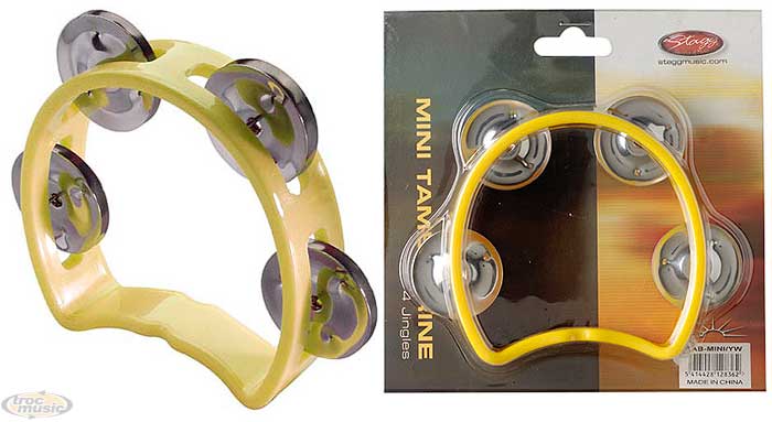 Mini tambourin en plastique avec 4 cymbalettes. Jaune.