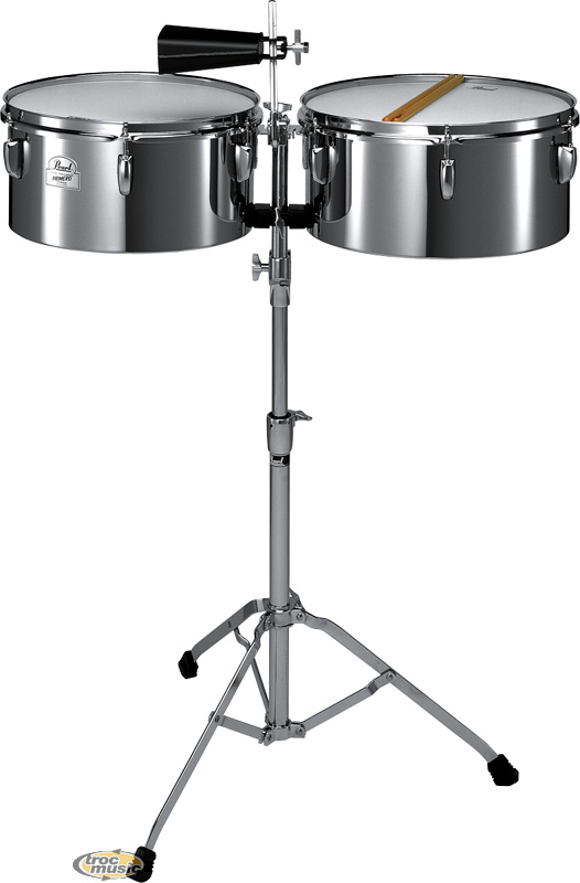 Timbales Primero acier 13''&14''. Livré avec un stand simple embase ajustable en hauteur, une cloche cha-cha 5'' (12 cm) et une paire de baguettes timbales.
