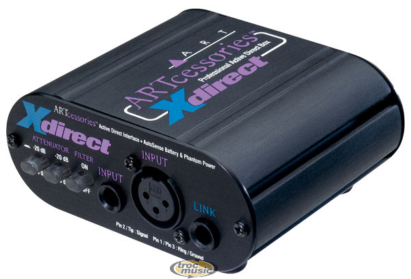 Boitier de direct ACTIF - Filtre et atténuateur de niveau commutables - Entrées symétrique (XLR) ou asymétrique (Jack 6,35mm). Commutateur pour Alimentation fantôme ou par pile 9V Sortie symétrique (XLR) et LINK.