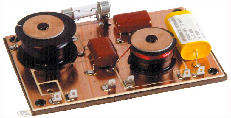 Filtre passif 3 voies. Fréquence de coupure : 500Hz / 3,5kHz. Pente : 12dB/octave Butterworth. Puissance admissible : 400w. Impédance : 8 ohms.