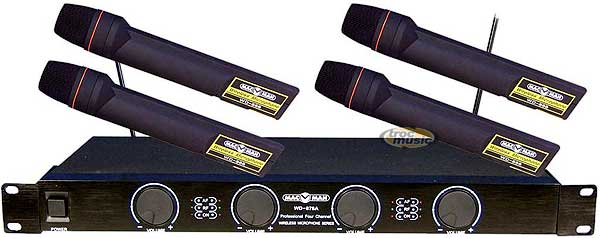 Système 4 micros main VHF, disponible en 2 modéles avec fréquences différentes, pile 9V, réglages séparé niveaux, sorties symétriques XLR/jack, rack 19'' 1U, livré en mallette avec accessoires.