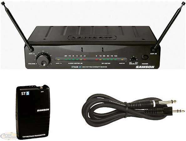 Système sans fil VHF diversity pour guitare électrique, basse ou tout autre instrument électro-acoustique. Composition : émetteur ceinture ST5, câble GC5 (mini jack 3,5 - jack 6,35 mm), récepteur SR55, adaptateur secteur, valise de transport.