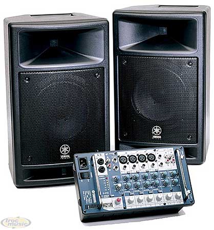 Système de sonorisation : console amplifiée 8 canaux (4 mono et 2 stéréo) détachable de l'enceinte (montable sur un pied de micro), amplificateur 2 x 150W Classe D, 2 enceintes passives. Livré avec 2 câbles haut-parleur de 5m et 1 câble secteur.