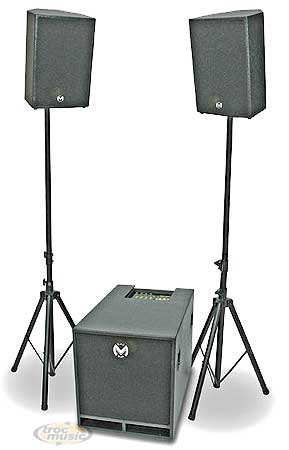 Système amplifié 800W avec table de mixage incorporée 4 voies. Réglage gain, égaliseur 2 bandes, volume, PAN, effet intégré. Caisson boomer 46cm 400W, 1 ampli pour les graves et 2 pour les satellites. Satellites impédance 4 ohms HP 12'' 30cm et moteur 1''.