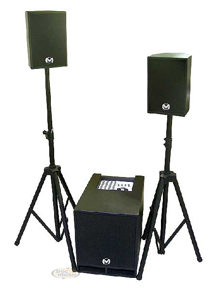 Système amplifié 300W avec table de mixage incorporée 4 voies, gain, égaliseur 2 bandes, volume, PAN, effet intégré avec master time et repeat, volume pour le caisson et les satellites. 1 Ampli pour les graves et 2 pour les satellites. Caisson boomer 25cm 150W, satellites 75W impédance 4 ohms HP 6.5'' et tweeter à dôme.