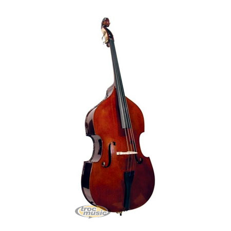 Contrebasse de taille 3/4. Table, dos et éclisses tilleul massif. Manche et chevalet érables. Filet noir. Touche acajou teinté noir. Finition vernis brillant. Livré avec archet, colophane, en softcase noir.