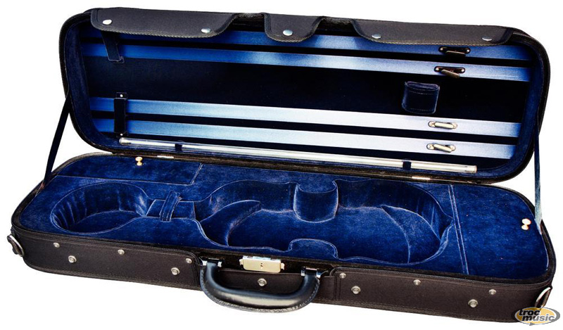 Coque bois. Housse vissée et poche pour partitions. Serrures. 4 fixes archets avec bandes de protections. 2 compartiments accessoires. Tube pour cordes et couvre-cordes. 2 bretelles sac à dos amovibles avec mousquetons métal. Poids 2,9 kg. Extérieur en Tex noir. Intérieur velours bleu foncé. Existe en taille 4/4, 3/4, 1/2.