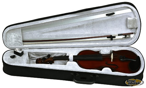 | Violon 3/4 préparé pour le jeu (sillet et cordes montés) livré avec un softcase, colophane et archet. Réglé par des luthiers en Allemagne, ce violon à toutes les qualités requises pour débuter. Garniture en bois dur. Table épicéa massive, fond érable massif. Filets. Vernis brun rouge foncé. Mentonnière. Cordier avec tendeurs. Archet en bois du Brésil, hausse ébène. Colophane. étui léger avec housse vissée et poche pour partition cousue. |