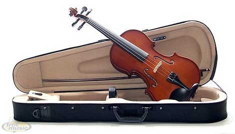 Violon série étude taille 1/4 pour enfants. Table épicéa massif, dos, éclisses et manche érable. Finition vernis brillant. Livré dans son étui avec colophane et petit guide d'accordage.